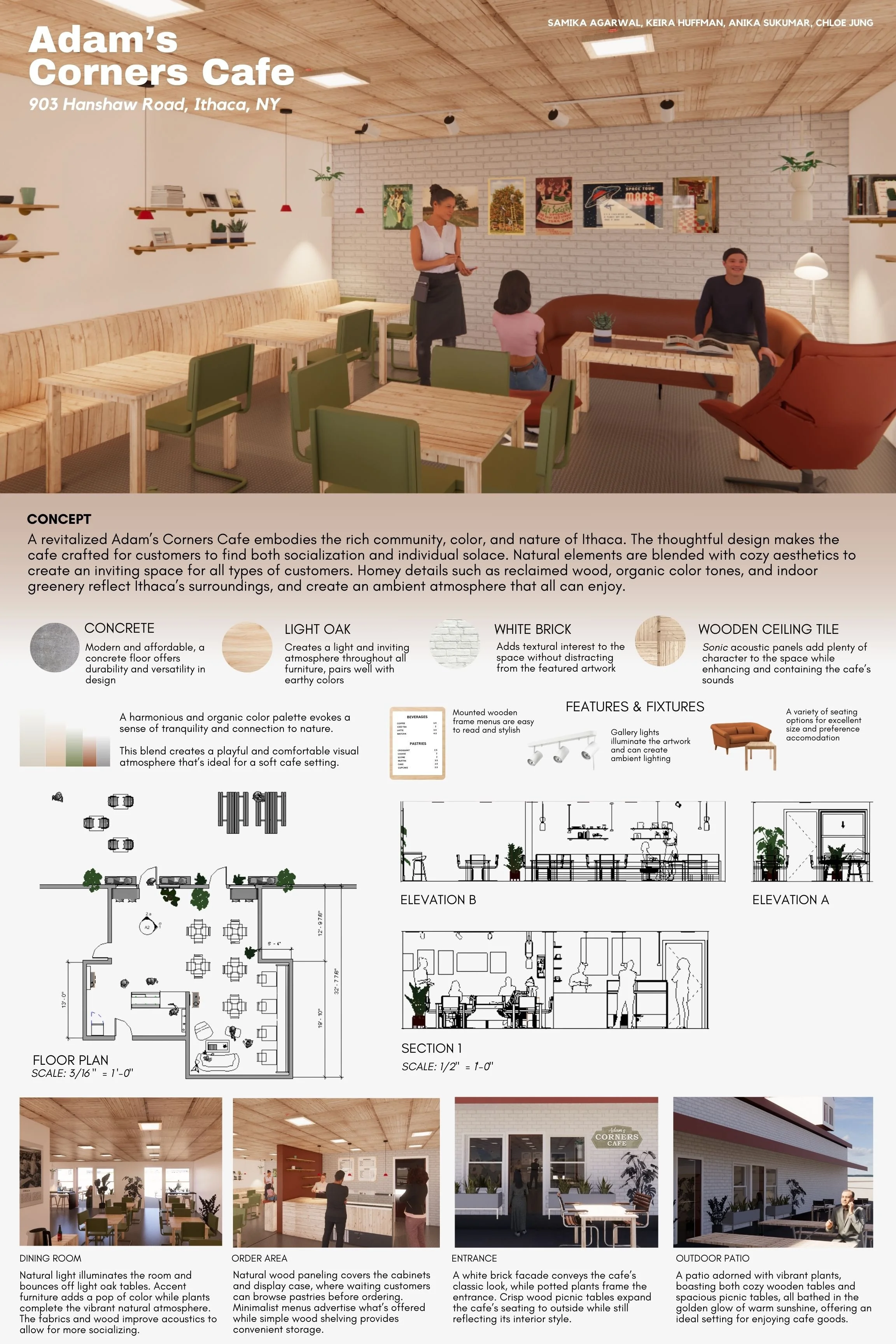 Through the Cornell Einhorn Center for Community Engagement, my team and I redesigned a local Ithacan cafe Adam’s Corners Cafe our DEA 1150 final project.