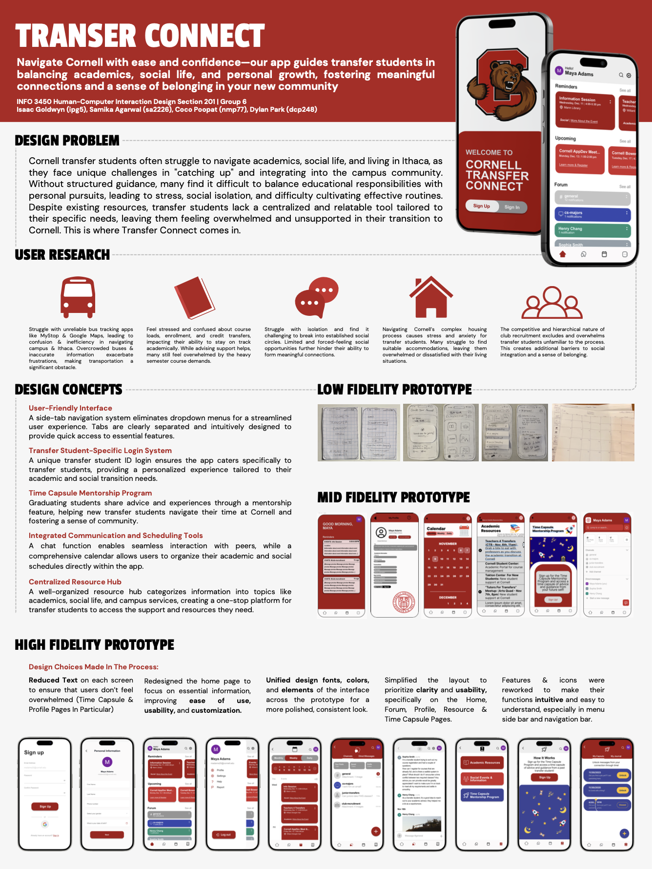 My team and I designed an app to help transfer students at Cornell navigate academic and social opportunities by providing personalized resources. By fostering meaningful connections and a sense of belonging, the app enhances their overall college experience and supports a smoother transition.