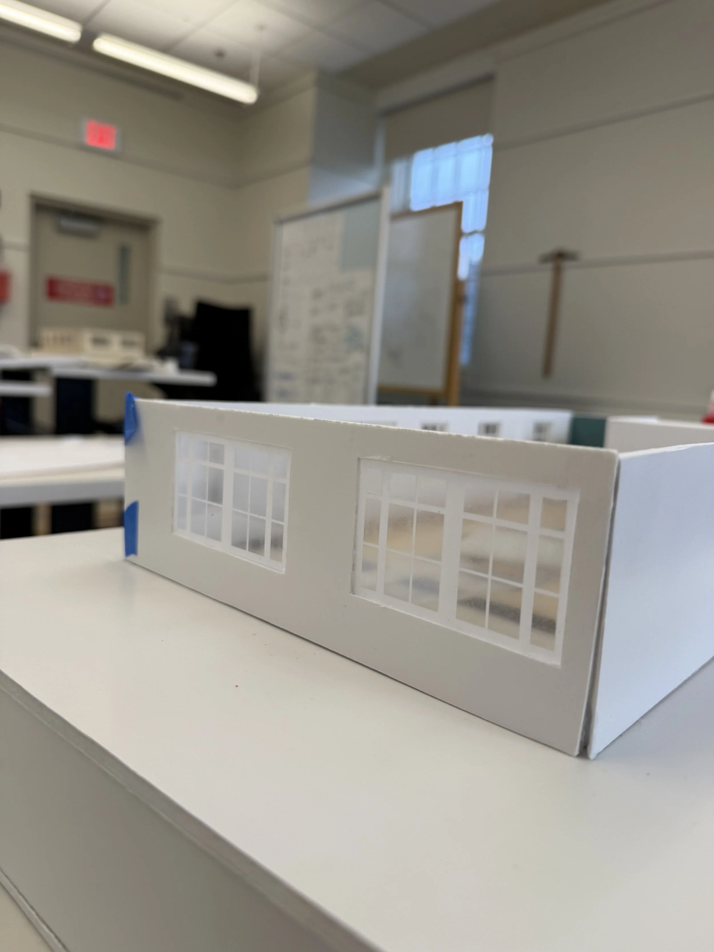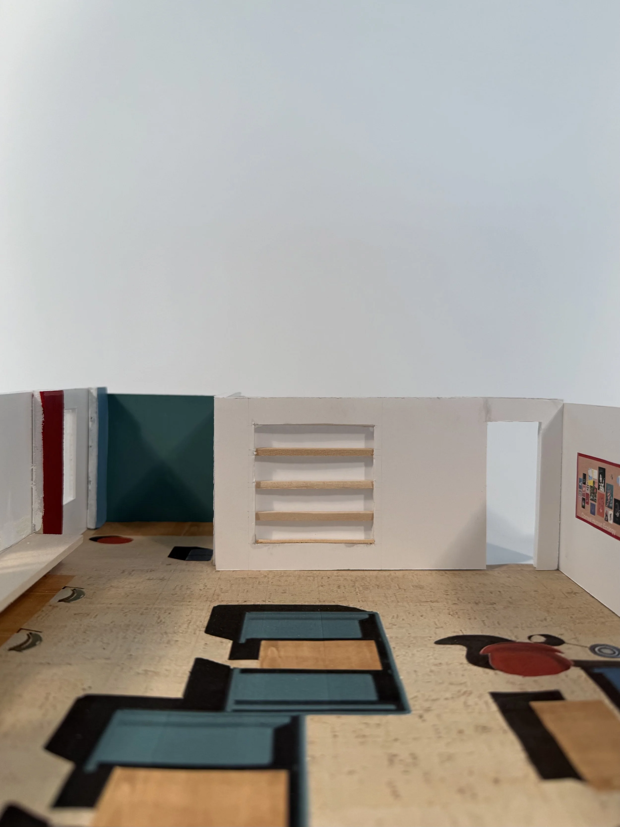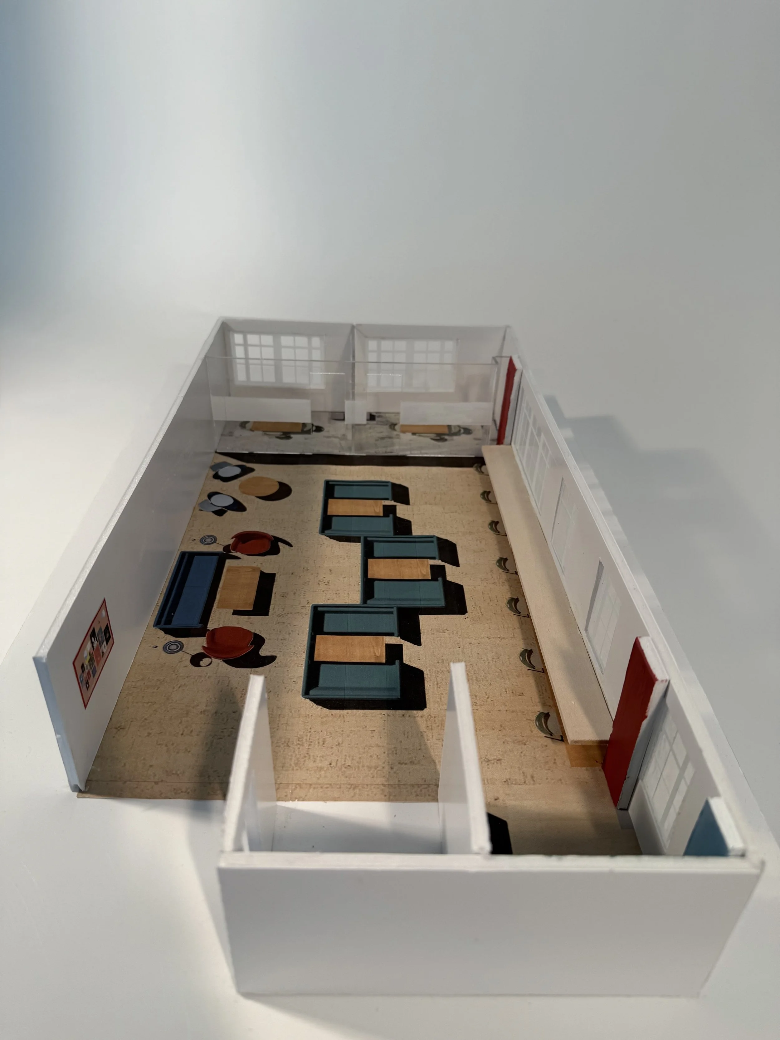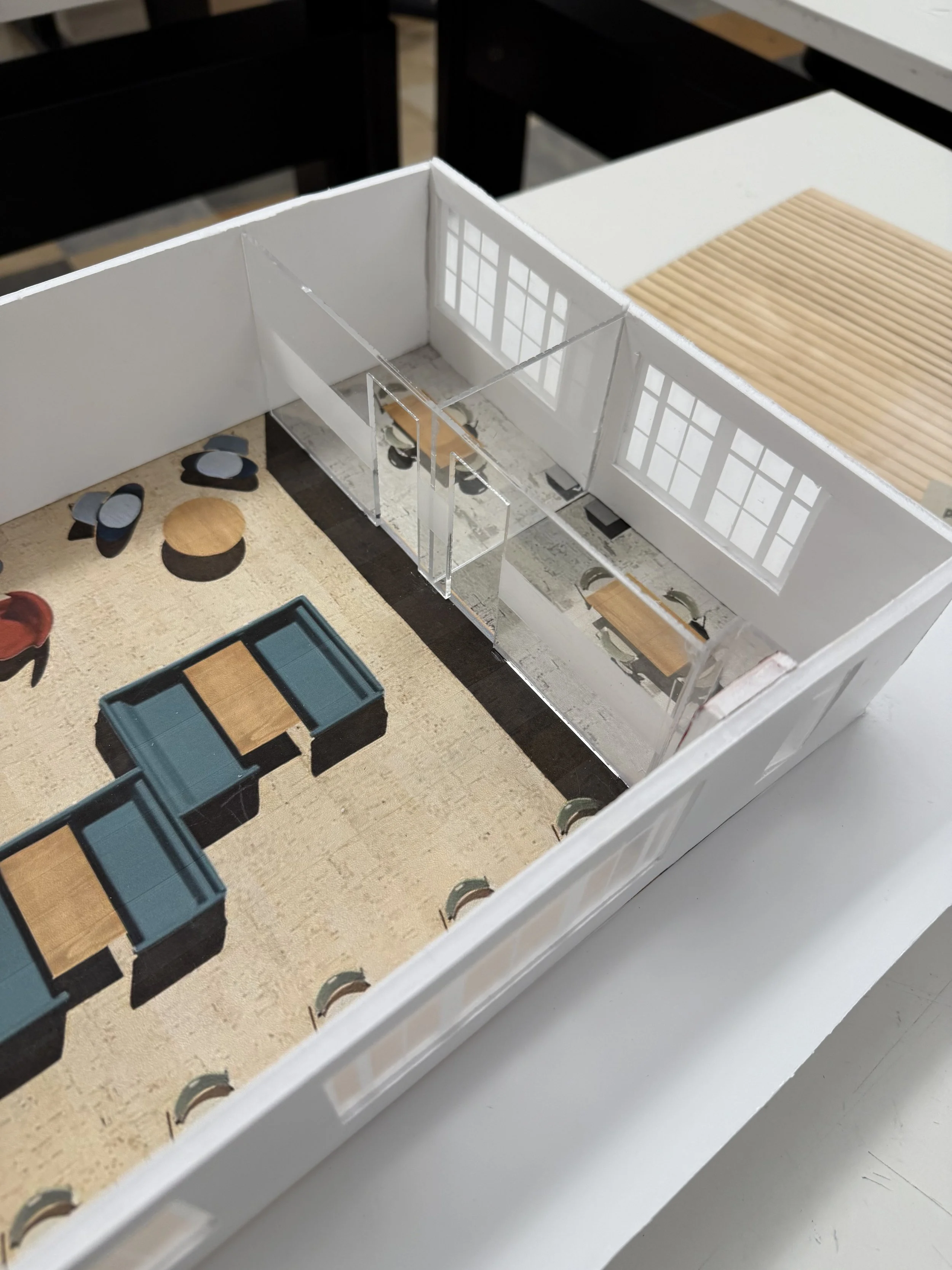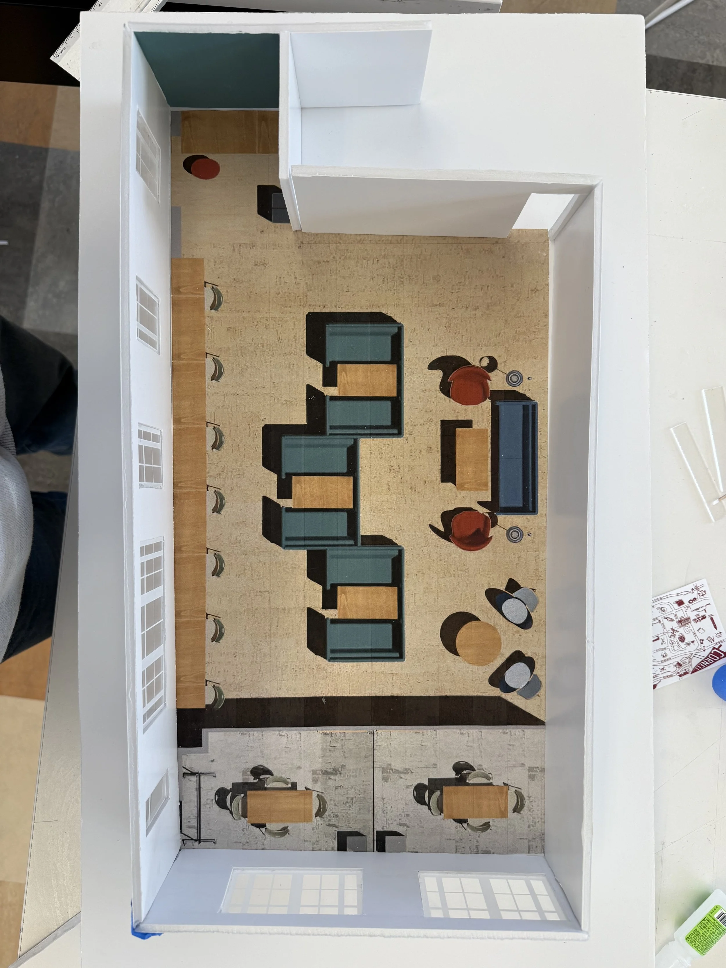 Through my sophomore studio, I worked with a client College of Human Ecology to redesign an underutilized study lounge in the MVR building. The goal was to create a welcoming, functional space that supports a range of student needs from quiet study and virtual meetings to casual group work. Grounded in user-centered research, including surveys, interviews, and experience mapping, my design emphasizes accessibility, flexibility, and sensory comfort. Inspired by the natural landscape of Ithaca, I also incorporated biophilic design elements, natural light, and a calming palette to promote focus and well-being. For the client, I created a presentation deck and to scale physical model with foamcore, wood, paint, acrylic, and paper.