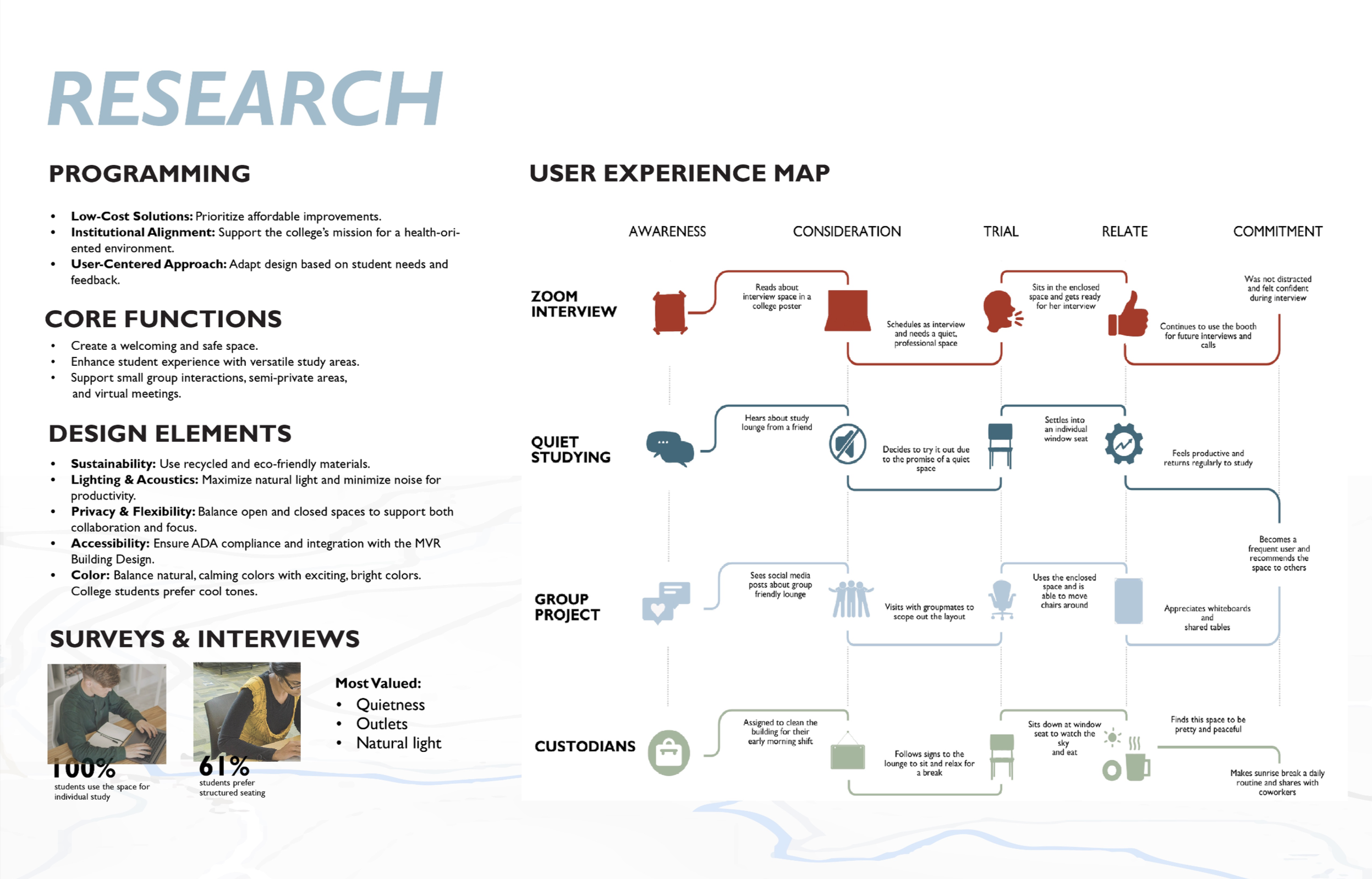 To understand both what I was designing and for whom, I conducted research across programming, core functions, design elements, surveys, and a user experience map. Key insights revealed that students value quietness, outlets, and natural light, while design priorities included sustainability, accessibility, and balancing collaboration with focus. The UX map traced how different users from students to staff discover, test, and return to the space, ensuring the design addressed real needs and encouraged ongoing engagement.