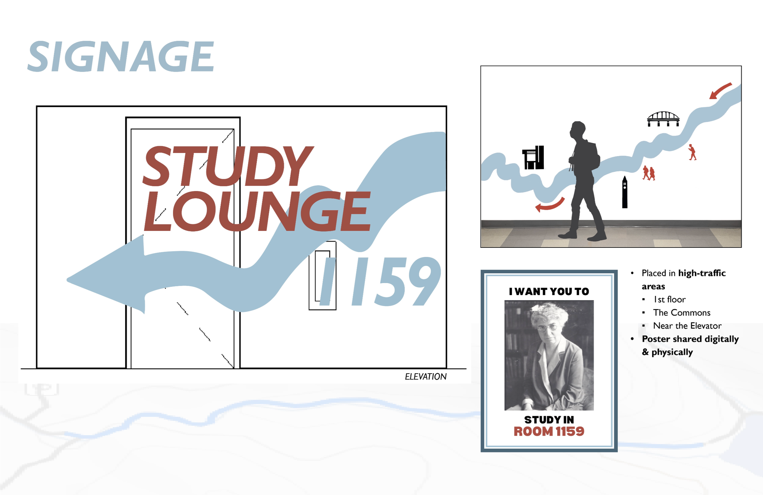 Recognizing that the study lounge was largely unknown to students, I designed a bold signage system to increase visibility and establish identity. Drawing inspiration from Cornell, Ithaca, and the building’s design context, I created a clip-art style map of campus along Fall Creek that guides users from the main foyer to the lounge entrance. Complementary posters, inspired by college history and infused with humor, further promote the lounge as a welcoming, student-friendly destination.