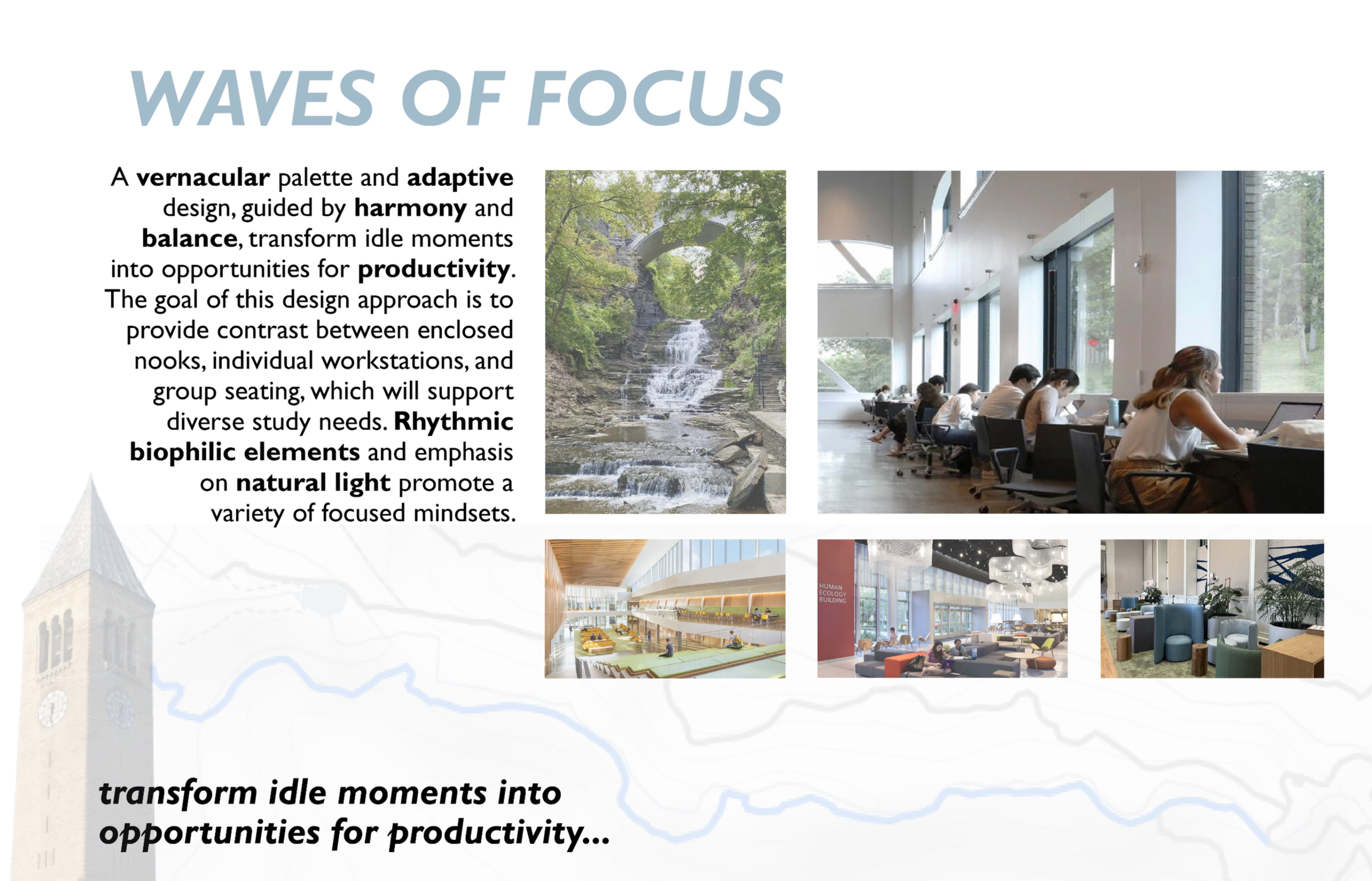This concept, Waves of Focus, explores how adaptive design can transform idle moments into opportunities for productivity. By balancing enclosed nooks, individual workstations, and group seating, the design supports diverse study needs but still prioritized individual study needs. Natural light, biophilic rhythms, and a vernacular palette create an environment that promotes harmony, focus, and well-being across different modes of study. Case studies I referenced mainly include spaces on campus and in MVR itself.