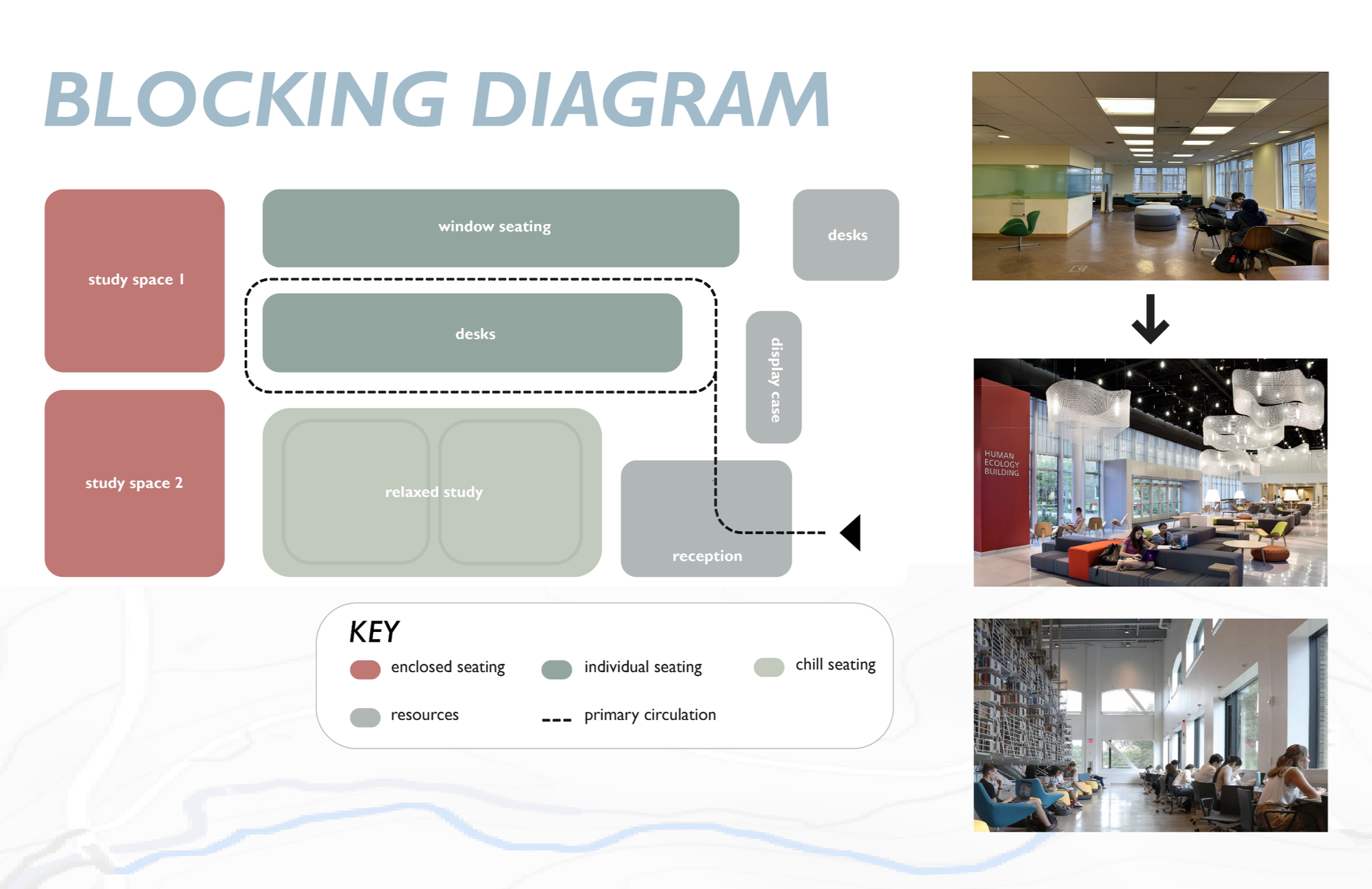 The blocking diagram organizes the lounge into clear zones and circulation paths directly informed by user research and the UX map. Enclosed seating is placed along the perimeter for quiet work and interviews, while desks are oriented to windows and middle for natural light and outlets, 2 of students’ top priorities. Relaxed seating in the back acts as a buffer between quiet and collaborative areas, supporting social breaks without disrupting focus. Reception and resources are near the entry for easy access, ensuring discovery, orientation, and repeat use.